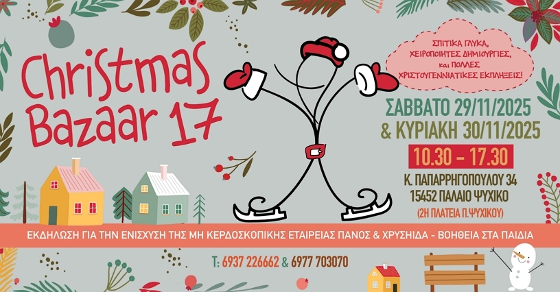 Και φέτος, όπως και πέρυσι, ο όμορφος χώρος που θα γίνει το Χριστουγεννιάτικο μας Bazaar προσφέρεται από τους γονείς της Χρυσηίδας, Αλέξανδρο και Ελένη Σπαχή το Σάββατο 29 και την Κυριακή 30 Νοεμβρίου 2025.